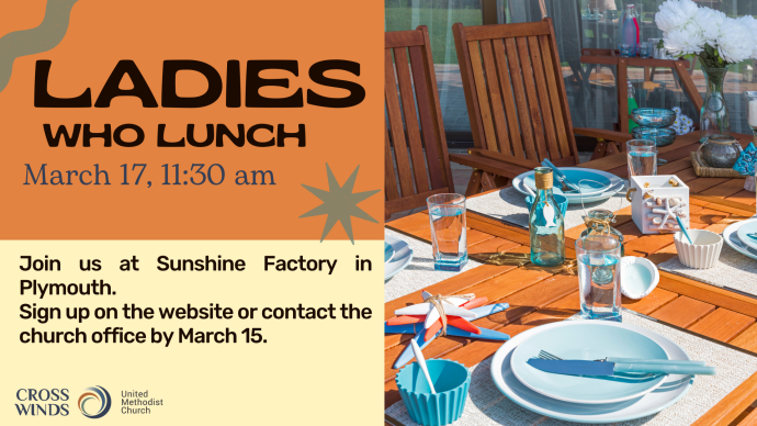 Ladies Who Lunch will gather on Tuesday, March 17 at 11:30 am at Sunshine Factory in Plymouth. Please sign up below or let the church office know so reservation can be...