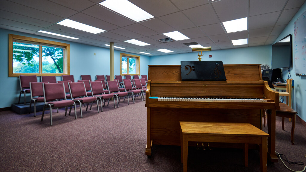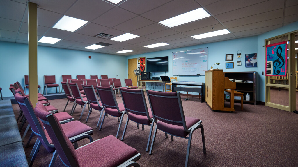 This rehearsal space includes seating for 30-40 people, a rehearsal piano, TV, and keyboard. Available for group meeting needs, but ideal for small group music rehearsals.