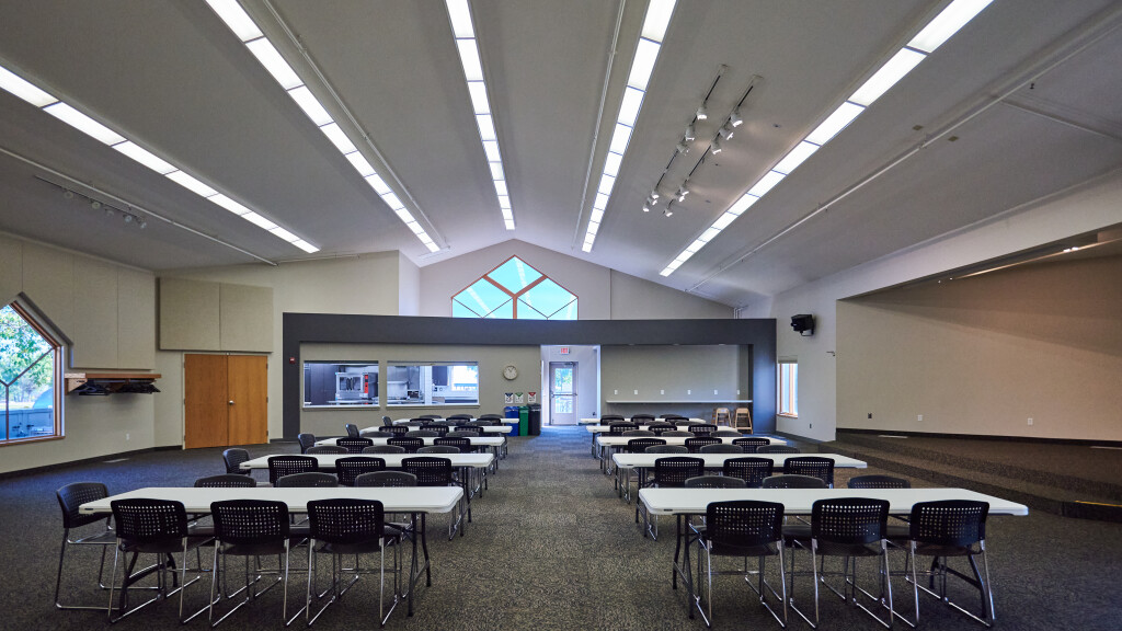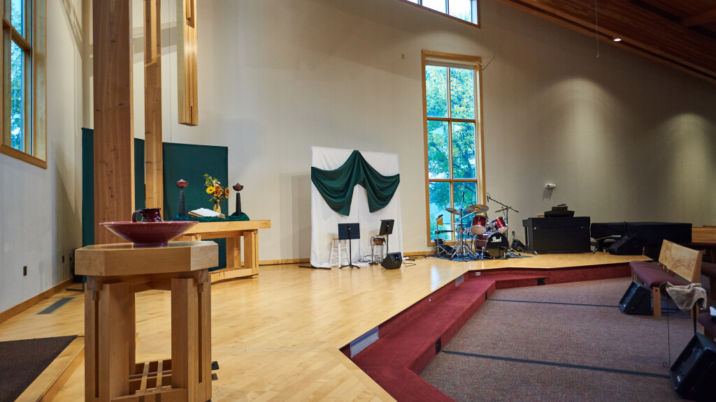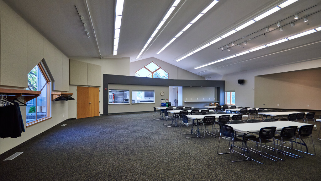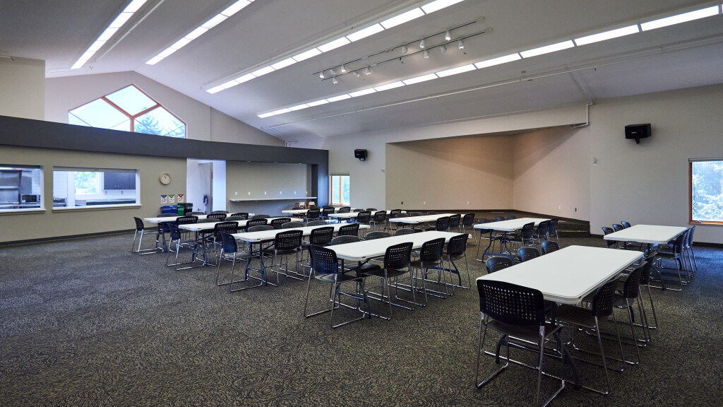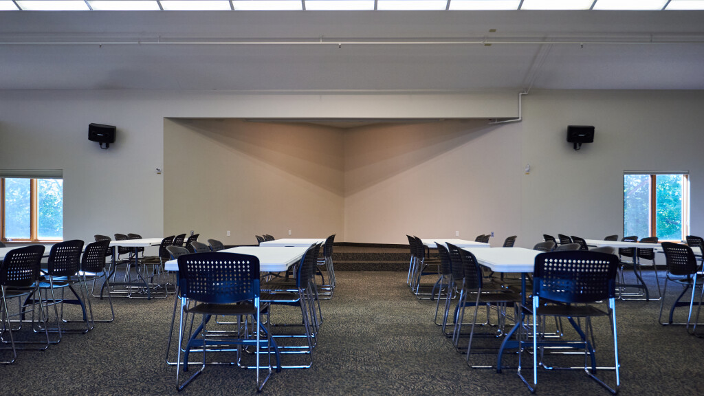 The Fellowship Hall comfortably seats up to 150 people for various event needs. This multipurpose event space also features a platformed stage area, Audio/Visual system for projection and sound, and a commercially licensed kitchen. Access to a deck with patio seating is also available seasonally when using the fellowship hall.
