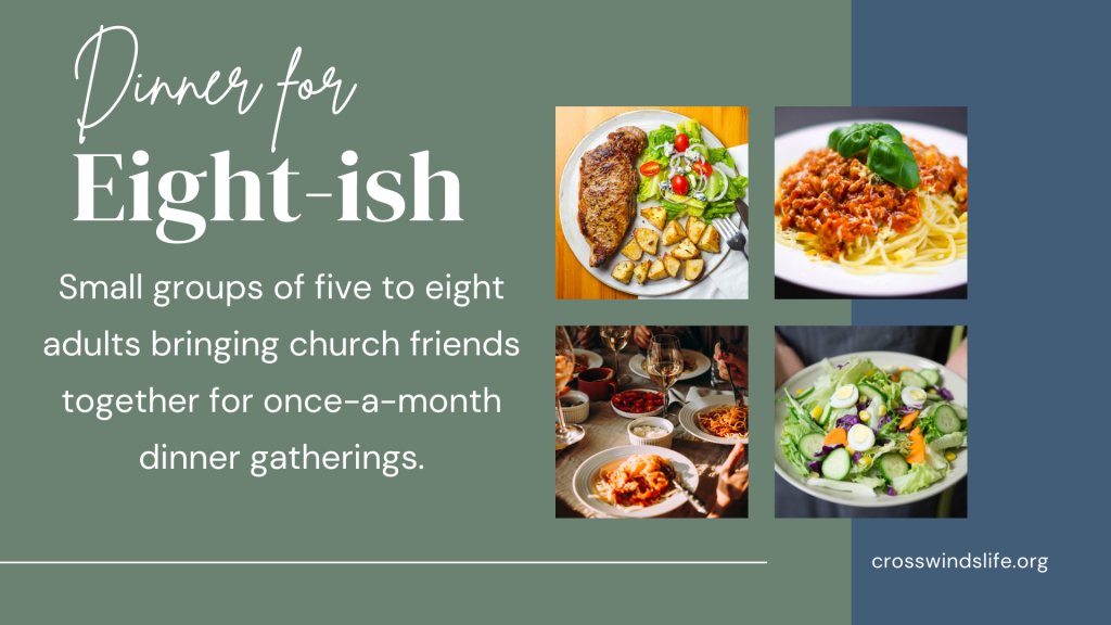Join a “Dinner for Eight-ish" group starting this January. These small groups of five to eight adults will bring church friends together for once-a-month dinner gatherings...