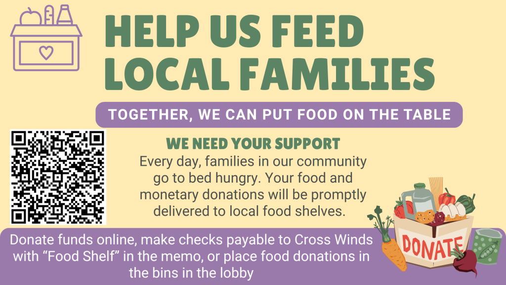 The Spirit of God is among us as we endeavor to work to help our neighbors in need.  Cross Winds is sponsoring a food drive and we are asking everyone to help in as many ways as you can. We will gather and disperse food donations to...