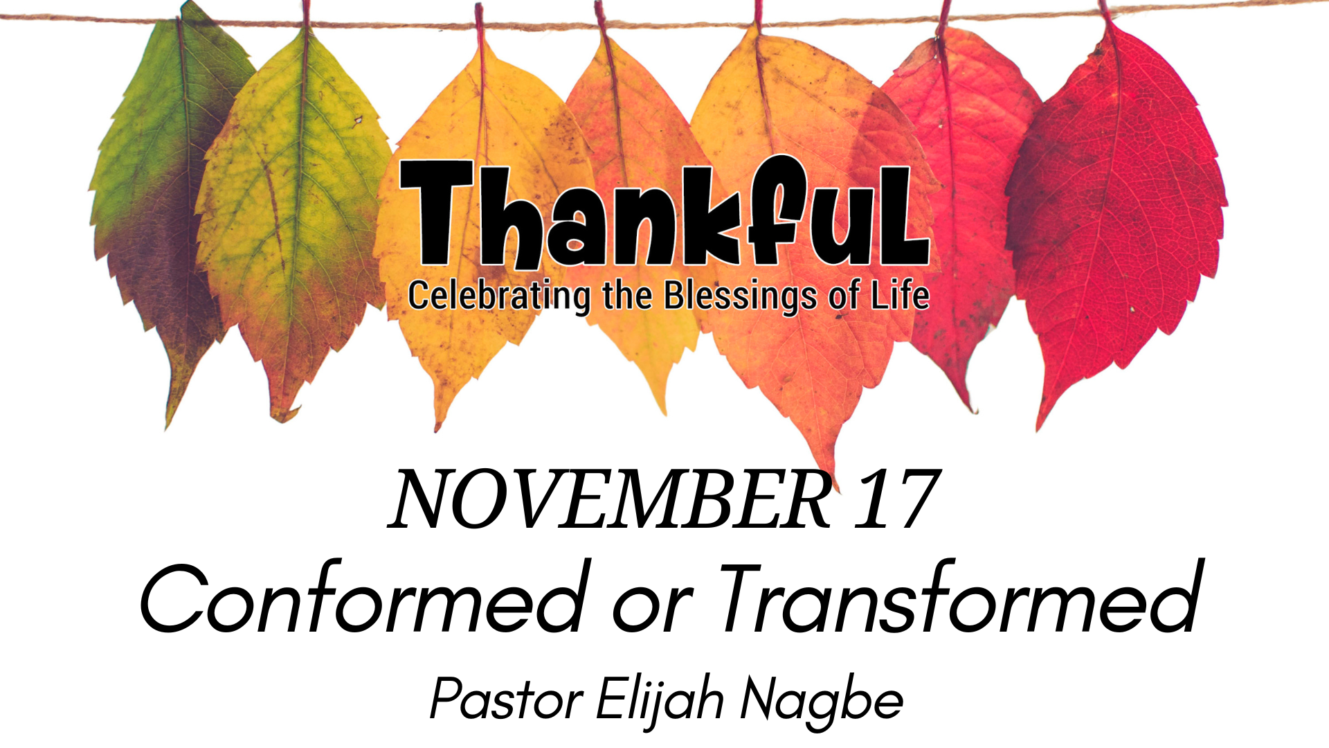 Conformed or TransformedNovember 17, 2024Series: Thankful: Celebrating The Blessings of LifePassage: Romans 12:1-8Speaker: Elijah NagbeWatch on YouTube